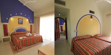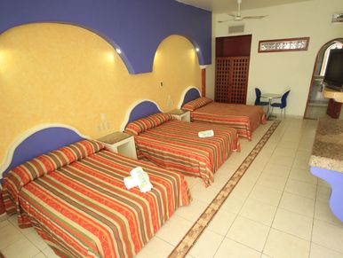 Habitación de una cama King Size y una matrimonial, cuenta con un espacio más amplio que la habitación Doble. Ocupación máxima de 5 Personas. Cuenta con aire acondicionado, ventilador de techo, televisión por cable y agua caliente.