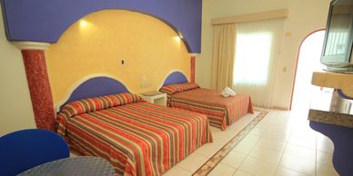 Habitación de dos camas Queen, cuenta con un espacio más amplio que la habitación Doble. Ocupación máxima de 4 Personas. Cuenta con aire acondicionado, ventilador de techo, televisión por cable y agua caliente.